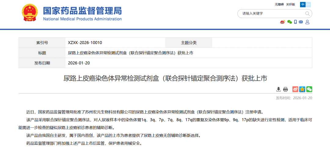 2026年1月20日,苏州宏元生物科技有限公司自主研发的“尿路上皮癌染色体异常检测试剂盒(联合探针锚定聚合测序法)”(商品名:U.CAD?)正式获得国家药品监督管理局三类医疗器械注册证(国械注准20263400126)。该产品是国内首个基于超灵敏度染色体不稳定性检测(U.CAD?)技术平台孵化的尿路上皮癌无创检测产品,标志着我国在肿瘤早诊领域从“技术跟随”迈向“原创引领”的关键一步。